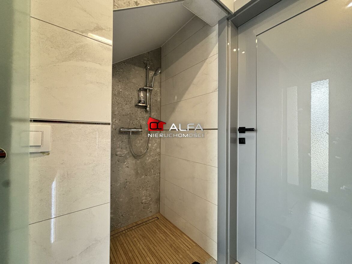 - PIĘTRO: 4 sypialnie (dwie z wyjściem na taras), pokój kąpielowy wyposażony w wannę oraz kabinę, hol. Ponadto, dom wyposażony jest w strych.
